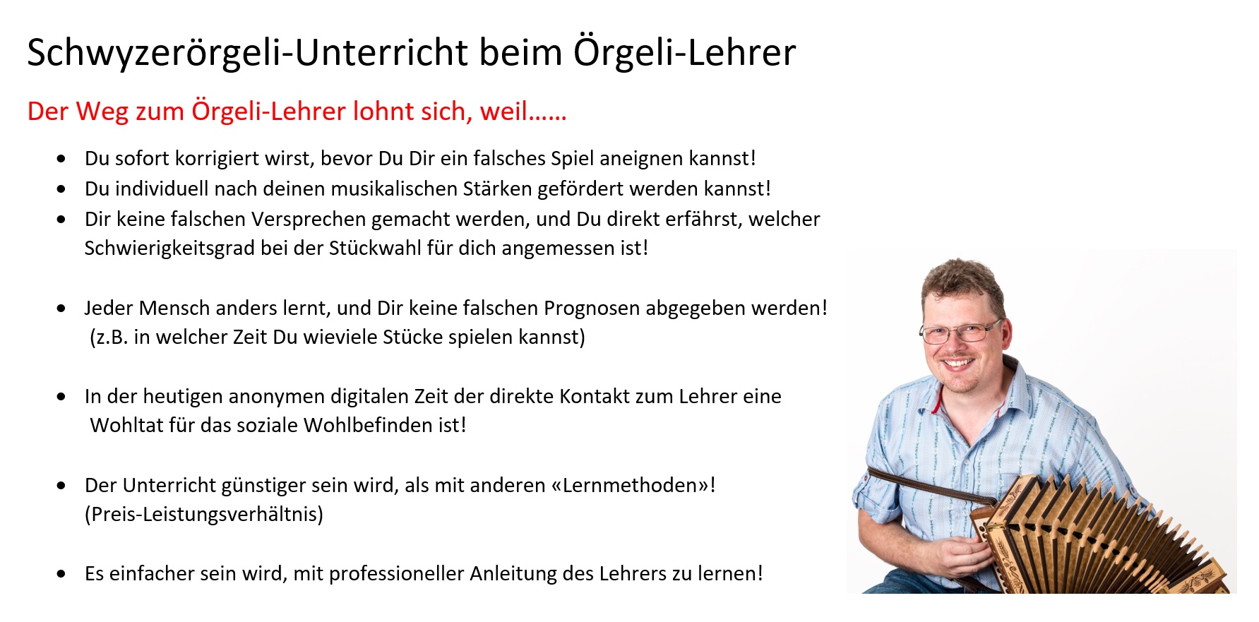 Durch seine Erfahrung, seine Geduld und seine Begeisterung fürs Schwyzerörgeli gewinne ich ständig an Sicherheit. Heute spiele ich viel sauberer, freier und mit mehr Ausdruck als je zuvor.